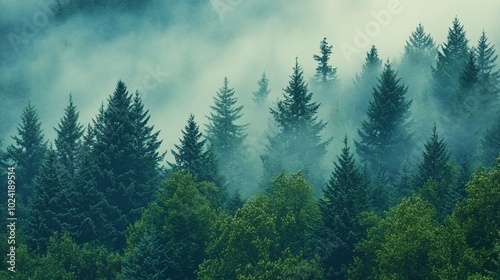 misty evergreen forest, atmospheric mountain landscape, fog-shrouded conifers, ethereal natural scenery, moody wilderness vista, layered tree silhouettes, soft diffused lighting