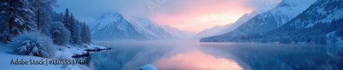 Misty fjord landscape with snow-covered trees and frozen lake at dusk during polar night, frozen, fjords, lake