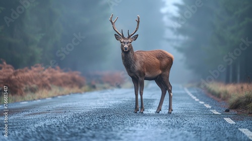 misty foggy morning with a deer standing on the road near the forest road hazards wildlife crossing and transport dangers in a peaceful rural landscape