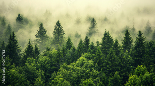 Misty forest aerial photograph with pine trees in foggy weather, Mysterious mist envelops a dense forest in winter days, abstract foggy forest atmospheric scene.