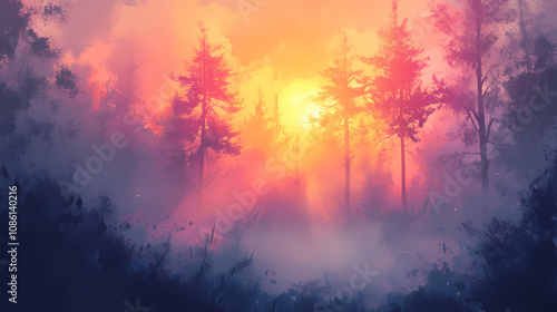 misty, forest, bathe, sunrise, light, foggy, dawn, morning, haze, fog, dawning, gold, daybreak, ray, sunbeam, glow, bright, glowing, mystical, illustration