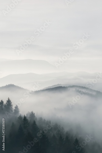 Misty forest landscape with fog covering pine trees and soft mountain silhouettes in the background