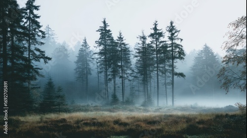 Misty forest landscape with tall evergreen trees shrouded in ethereal fog.