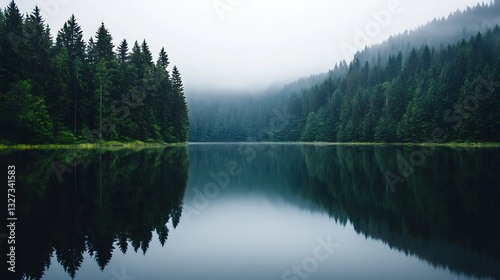 Misty Forest Landscape with Trees and Still Water Reflection on Lake : Generative AI
