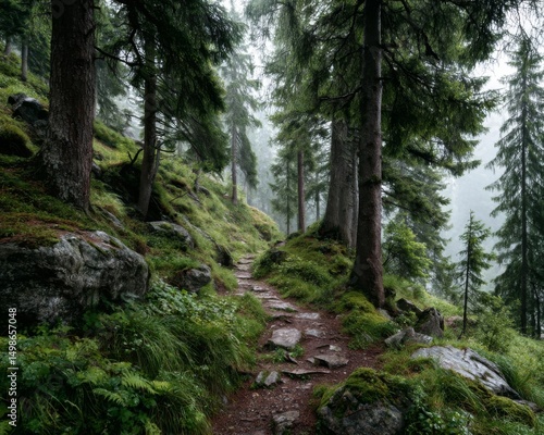 forest, path, tree, nature, wood, hiking, trail, mountain, green, rock, fog, mist, rain, mossy, lush, scenic, landscape, summer, spring, walk, journey, adventure, travel, exploration, calm, serene, peaceful, tranquil, quiet, solitude, mystery, dark, shadow, light, atmosphere, mood, ambience, environment, wild, natural, view, panorama, beautiful