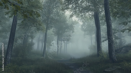 Misty forest path with tall trees creating a moody and atmospheric scene