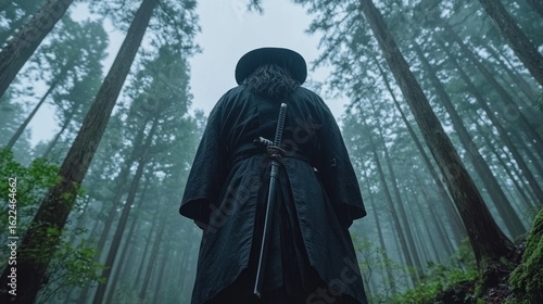 forest, misty, dark, cloak, person, back, tree, nature, wood, gown, long, tall, vertical, foggy, rain, calm, still, mystery, shadow, zen, warrior, samurai, sword, black, hazy, viewpoint, perspective, tranquil, contemplative, solo, adventure, travel, long hair, hat, asian, ancient, spiritual, mysterious, focused, determined, silent, enchanted, serene, observing, gloomy, standing