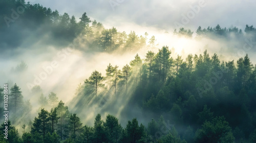 misty, forest, sunrise, sunlight, tree, pine, nature, landscape, morning, fog, serene, tranquil, wooded, evergreen, haze, atmospheric, light, ray, dawn, mist, natural, scenery, environment, peaceful, green, wilderness, lush, foliage, overcast, calm, shadow, mysterious, twilight, vista, vibrant, clear, soft, bright, cool, ambient, earthy, refreshing, quiet, majestic