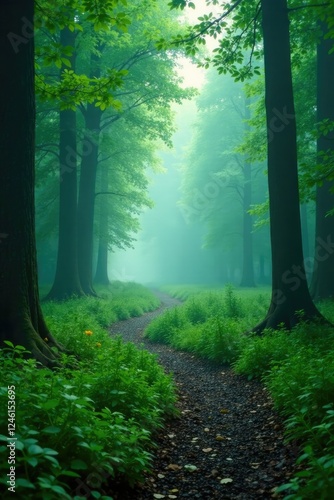 green, morning, trail, landscape, path, tree, mist, forest, fog, nature