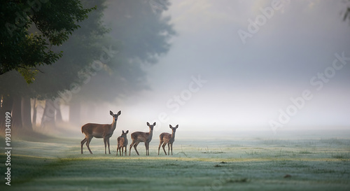 cervid, wildlife, grazing, morning, fog, peaceful, animal, doe, family, clearing, grass, dew, nature, photo, serene, soft light, wild animal, habitat, timberland, wood, calm, quiet, beautiful, scenic