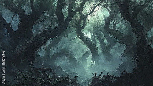 misty, gloomy forest filled with twisted trees and eerie atmosphere