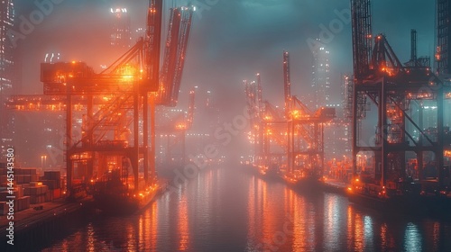 harbor, port, crane, cargo, night, city lights, mist, fog, industrial, logistic, transportation, water, dock, pier, urban, city landscape, skyline, illuminated, glowing, orange, machinery, equipment, loading, unloading, freight, export, import, trade, commercial, business, dark, evening, dusk, waterfront, architecture, building, structure, distribution, transport, storage, depot, warehouse, technology, complex, metallic