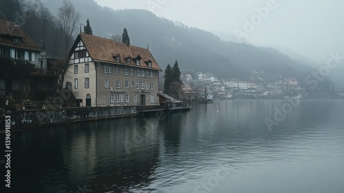 lake, building, mist, fog, water, hill, mountain, landscape, nature, scenic, calm, serene, peaceful, tranquil, grey, blue, brown, historic, architecture, travel, photo, view, outdoors, image, photo, picture, still, historical, misty, foggy, day, beautiful, amazing, stunning, awesome, breathtaking, picturesque, idylli, charming, elegant, classic, house, village, scene, vista, shoreline, sky