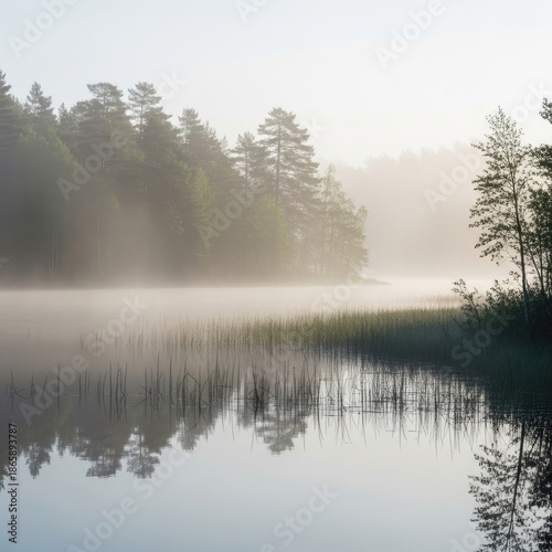 mist, fog, lake, water, sunrise, dawn, morning, nature, landscape, forest, tree, calm, serene, peaceful, tranquil, quiet, atmosphere, light, sun, sky, outdoors, scenic, view, environment, natural, beauty, wilderness, timberland, shore, bank, reed, plant, vegetation, summer, season, cool, fresh, air, haze, shimmer, glow, horizon, background, scene, setting, idylli, picturesque, remote