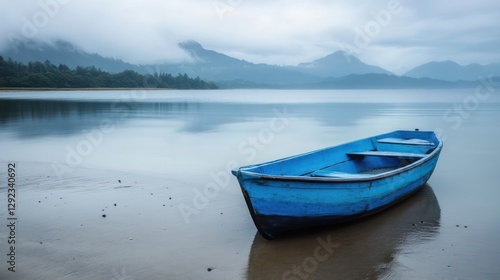 dinghy, lake, misty, mountain, blue, water, boat, calm, serenity, nature, landscape, scenery, outdoors, travel, vacation, relaxation, peaceful, tranquil, quiet, serene, still, fog, mist, cloudy, sky, dawn, dusk, morning, evening, river, ocean, sea, shore, coast, beach, summer, spring, autumn, winter, solitude, image, photo, photo, picture