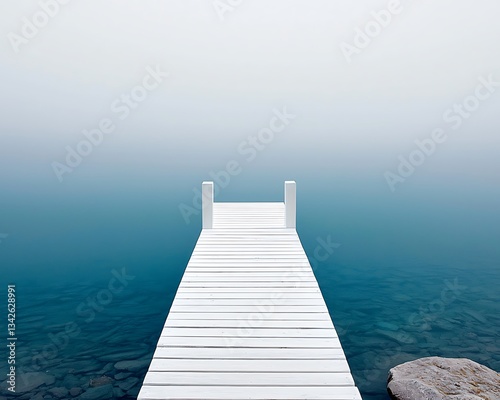 lake, dock, pier, water, mist, fog, serenity, calm, peaceful, calmness, quiet, solitude, stillness, blue, teal, white, wood, wooden, nature, landscape, scenery, summer, morning, evening, dawn, dusk, horizon, minimalist, simple, clean, abstract, background, texture, image, photograph, photo, picture, travel, vacation