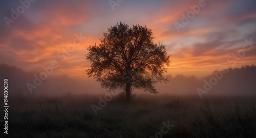 misty meadow with solitary tree silhouetted against vibrant sunrise sky.