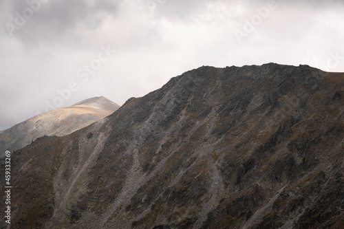 Misty, moody, abstract view of a mountain range on a cloudy day with distant peak lighten by soft, golden sunlight