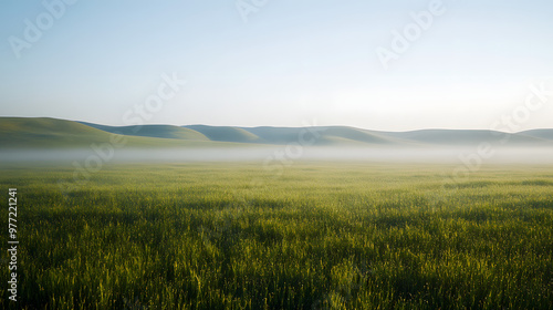 plain, rolling, hill, misty, morning, dew, grass, light, peaceful, natural, huge, expansive, serene, landscape