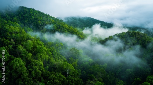 Misty morning in dense forest with mysterious ambiance and foggy weather