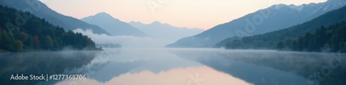 Misty morning over a lake with surrounding mountains and forest, serene, peaceful, mountains