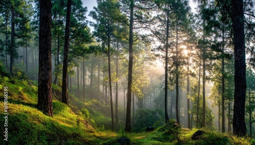 forest, misty, sunbeam, pine, tree, nature, morning, sunlight, fog, lush, green, hillside, landscape, tranquil, calm, peace, scenic, wood, growth, mountain, view, path, vegetation, elevation, forestry, ecology, wild, light, beauty, fresh, vigorous