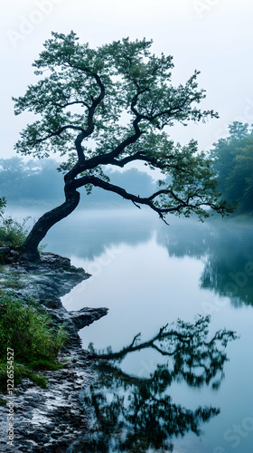 Misty morning, tree reflected in tranquil lake, serene landscape, perfect for meditation or nature themes