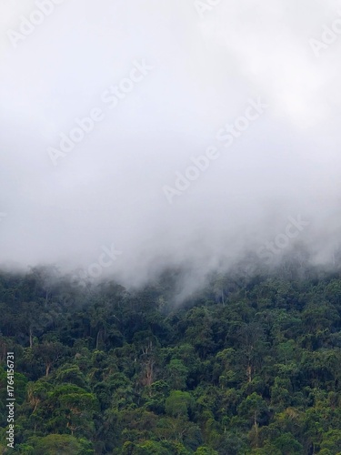 Misty mountain forest landscape with lush green trees and ethereal cloud cover, perfect for travel inspiration or nature themed projects