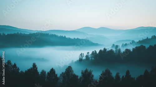 Misty Mountain Landscape with Soft Dawn Light and Blue Hues