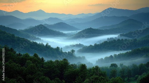 colourful, elevation, forest, fog, hazy, calm, view, morning, hill, serene, deep, timberland, forested, outdoors, mist, misty, sunrise, scenic, blue, nature, beauty, panoramic, early, vale, light, tree, landscape, green, vibrant, mountain, dramatic, tranquil, idylli, peak, layer, horizon