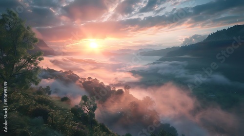 sunrise, mountain, mist, fog, sky, cloud, landscape, nature, dawn, morning, gold, light, horizon, view, hill, tree, green, pink, orange, purple, blue, tranquil, serene, peaceful, beautiful, dramatic, majestic, scenic, atmospheric, dreamy, vibrant, soft, airy, art, digital, painting, photo