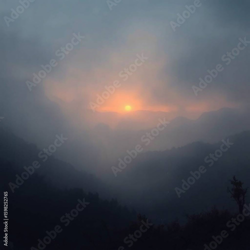 Misty Mountain Sunset: Serene Landscape with Sun Peeking Through Clouds.