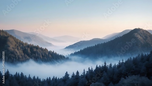 mountain, vale, forest, tree, mist, fog, sunrise, morning, blue, sky, cloud, scenic, landscape, nature, peaceful, serene, tranquil, calm, quiet, beautiful, majestic, awe, wonder, inspiring, breathtaking, magical, mystical, aethereal, dreamy, soft, light, shadow, colours, contrast, texture, depth, perspective, horizon, view, panorama
