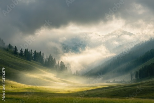 forest, gold, stunning, view, misty, sunlight, light, explore, breathtaking, cloud, beauty, sunrise, green, peaceful, adventure, pine, hill, sunbeam, fog, coniferous, dramatic, nature, picturesque, tree, landscape, field, serene, tranquil, amazing, grass, morning, travel, scenic, mountain, meadow, vale