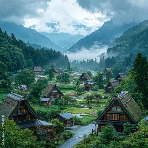 village, house, mountain, mist, fog, vale, green, tree, rural, landscape, scenery, nature, traditional, architecture, japanese, asia, farm, field, countryside, idylli, peaceful, serene, tranquil, calm, quiet, beauty, stunning, breathtaking, picturesque, charming, travel, destination, holiday, vacation