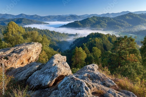 mountain, mist, vale, fog, landscape, sunrise, rock, forest, green, nature, panorama, viewpoint, hill, hill, scenic, elevation, autumn, cloud, light, sunlight, stone, travel, exploration, hiking, peak, top, outcrop, rugged, dense, tree, pine, misty, expansive, serene, tranquil, huge, beautiful, clear, blue, sky, horizon, majestic, wild, untouched, wood