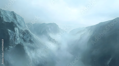 Misty mountains create serene and mysterious atmosphere, with fog enveloping rocky peaks. cool tones evoke sense of calm and solitude.