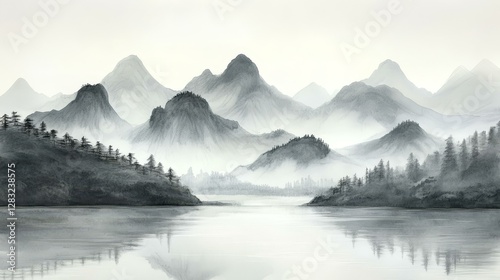 landscape, mountain, mist, fog, nature, water, lake, tree, forest, art, painting, greyscale, watercolor, chinese, view, still, calm, peaceful, minimalist, artistic, monochrome, impressionism, mountain chain, pine, scenic