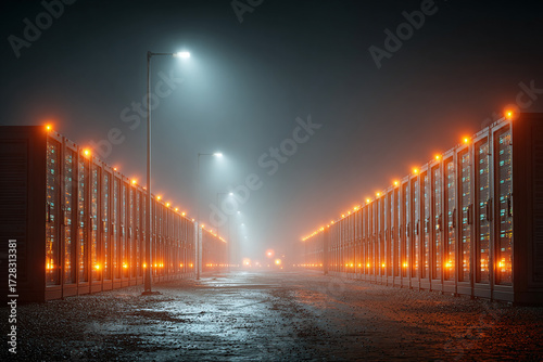 Misty Night Scene, Illuminated Storage Units, Urban Environment, Photographic Capture, Eerie Atmosphere, Wide-Angle View