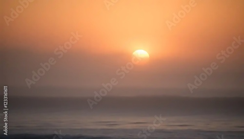 ocean, sunset, sun, sky, water, mist, foggy, haze, horizon, beach, wave, sea, sunrise, evening, morning, calm, peaceful, serene, tranquil, quiet, atmosphere, colours, orange, yellow, gold, light, glow, beauty, nature, landscape, scenic, view, picturesque, dramatic, soft, blurry, dreamy, aethereal, mood, feeling