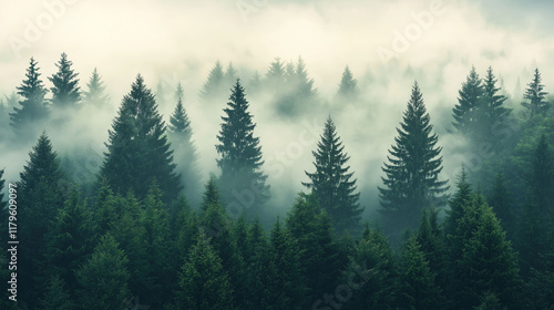 Misty pines forest on the mountain slope in a nature reserve or park. Forest of evergreen trees shrouded in fog on mountains background