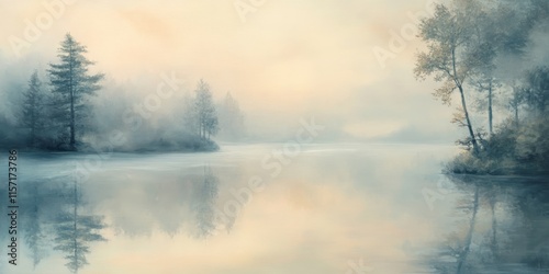 Misty reflections over a serene lake, capturing the enchanting atmosphere of a foggy landscape at the lake, enhancing the beauty of the lake in all its mysterious charm.