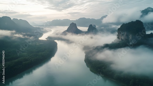 river, vale, mountain, karst, mist, fog, cloud, sunrise, morning, scenic, landscape, aerial, view, drone, photo, nature, tranquil, serene, peaceful, calm, quiet, majestic, breathtaking, beautiful, stunning, impressive, green, lush, vegetation, jungle, forest, tree, rock, cliff, water, reflections, light, shadow, sky, atmosphere, aethereal, mystical