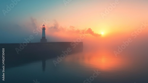 sunrise, lighthouse, pier, fog, mist, ocean, sea, harbor, sky, cloud, morning, calm, water, light, golden hour, tranquil, beautiful, scenic, view, travel, vacation, destination, photo, nature, landscape, coastal, architecture, landmark, seascape, marin, outdoors, serenity, misty, dramatic, colourful, gold, vibrant, calmness, adventure, explore, destination, horizon, atmosphere