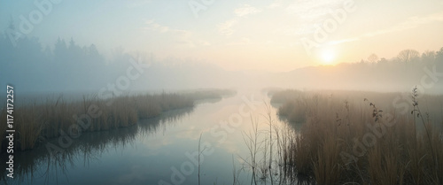 water, sunrise, mist, marsh, habitat, landscape, serenity, calm, grass, river, nature, scenery, calmness, ecology, wetland, morning, peaceful, environment, flora, fauna, scene, detail, beauty, landform, soothing, colours, hue, wilderness, exploration, expanse, novelty, scenic, beautiful, wildlife, harmonious, waterway, relaxing, eco, bio, area