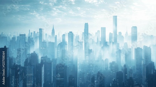 Misty Urban Skyline at Dawn with Soft Blue Tones and Shadows