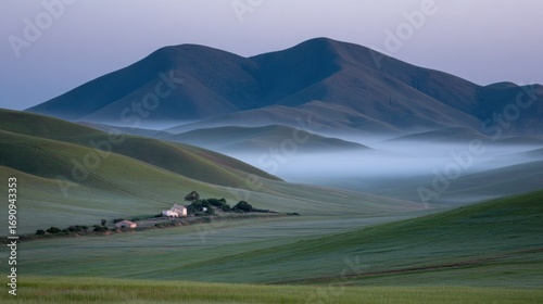 misty, vale, hill, mountain, foggy, sunrise, landscape, green, field, rolling, farmland, rural, tranquil, calm, serenity, gentle, nature, outdoors, dawn, dusk, early, quiet, peaceful, expansive, elevated, view, panorama, horizon, cloud, colours, blue, grey, light, soft, delicate, gradual, hazy, farm, house, vegetation, terrain, serene, natural, arable