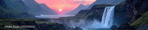 Misty veil rises from waterfall in Rocky Mountain with red dawn glow, mountain range, waterfall, peaceful atmosphere