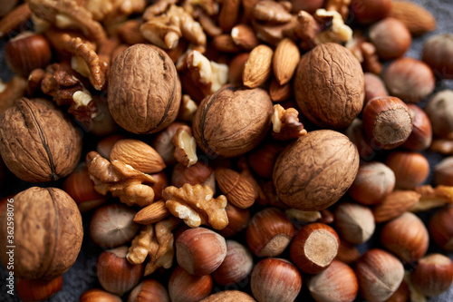 Mix of different nuts, background wiith walnuts, almonds and hazenuts