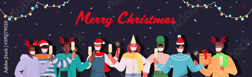mix race people in masks celebrating new year christmas holidays coronavirus quarantine concept portrait horizontal vector illustration